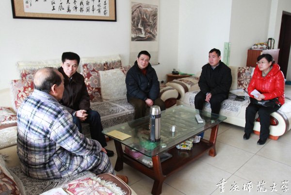 1月16日,校领导杨新民、陈志军、孔春阳带领党政办、组织部、人事处、离退休处、图书馆、历史与社会学院、文学院、地理与旅游学院部门负责人分别慰问了周敬毅、李固一、欧恢章、冯承藻、何忠信、袁永立和毛述仪离退休教职工,并给他们送上了慰问金,把党、政府和学校的温暖与关怀送到了这些教职工心中。当天,校领导陆远权也代表学校党政专门慰问了在职教职工,并给送去慰问。每到一位教职工家中,校领导都详细地询问了他们的身体、生活情况,祝老同志新春快乐、身体健康、合家幸福。