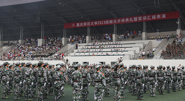 军训汇报表演上,39个连队踏着整齐的步伐,喊着响亮的口号,依次通过主席台接受检阅。由2015级女生组成的“军中绿花”——女子擒敌拳方队,率先进行表演。她们巾帼不让须眉,展示出“女兵”的飒爽英姿。由2015级男生组成的防爆小分队,在演习中,进行了楔字形、H形、U形的队形变换,展示出男儿的血性。汇演最后,表演方队和着高昂的乐声,从不同方向有序汇集,摆出“中国梦”、“CQNU”、“八一”与“70”等字样,并用手语演绎歌曲《国家》。他们精彩的表演赢得了观众的热烈掌声。