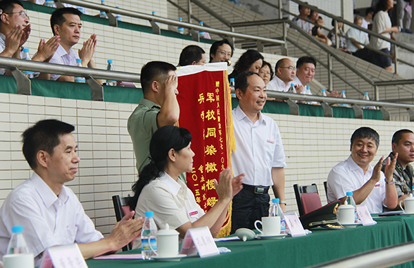 副校长孔春阳宣读了军训先进连队和优胜方队的名单。校党委书记邓卓明向承训部队负责人赠送锦旗。