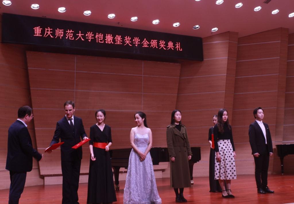 随后,鲁福崇书记宣布获奖名单。著名钢琴家乔万尼·维塔莱蒂、钞爱明主席、黄宗简助理和牟瑛总经理为林婕(16级钢琴表演专业)、郑淋木(16级钢琴表演专业)、柯映璇(16级研究生声乐表演专业)、李沛欣(16级研究生钢琴表演专业)四位获奖学生颁奖。