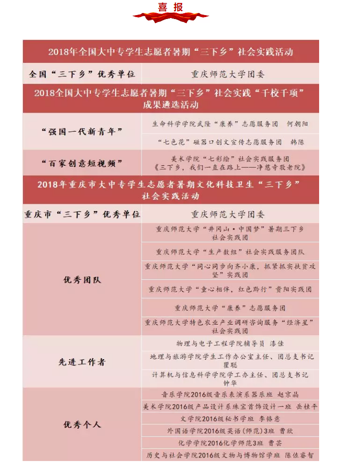 据悉,今年暑期大学生社会实践活动在各学院的高度重视和积极配合下,主题鲜明、重点突出、组织有序。全校共组建“三下乡”社会实践实践团226支,参与人数14000余人,分赴重庆主城部分片区、延安、贵阳、城口、井冈山等地开展调研实践。大学生暑期实习共组建了15个实习小组,共576名学生参与,涉及实习单位190个,选派各学院的辅导员担任带队老师,负责全程指导学生实习工作。先后荣获2018年全国“三下乡”优秀单位、重庆市2018年“三下乡”优秀单位荣誉称号。在由团中央发起的“千校千项”高校大学生暑期社会实践优秀团队评选活动中,bw必威生命科学学院武隆“康养”志愿服务团何朝阳、地理与旅游学院“七色花”磁器口创文宣传志愿服务团韩陈两位同学获得“强国一代新青年”荣誉称号,美术学院“七彩绘”社会实践服务团凭借视频《三下乡,我们一直在路上—净慈寺敬老院》获得“百佳创意短视频”等多个荣誉称号。