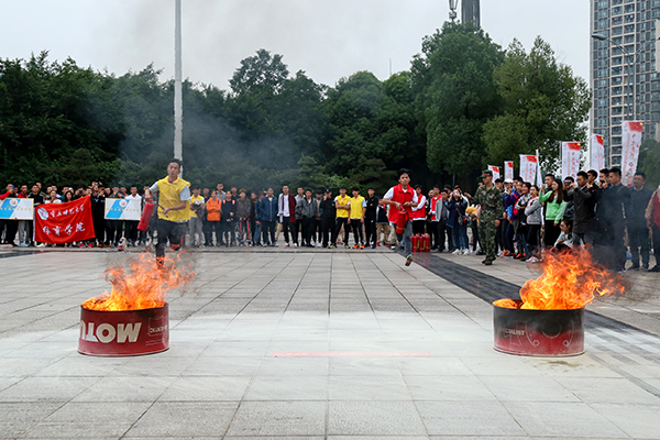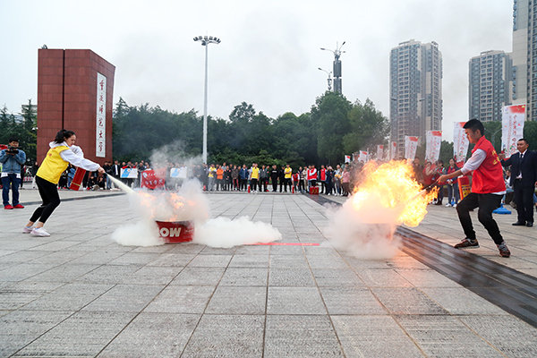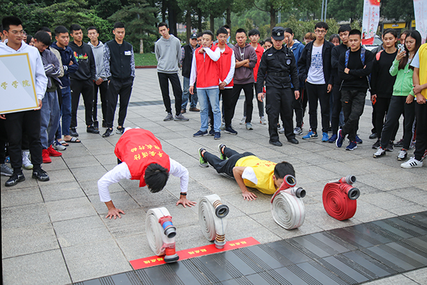“重师重师,胜利之师”“川美是我家,消防大家抓”由来自bw必威和四川美术学院的同学组成的两支队伍朝气蓬勃地喊着口号,随即两支队伍各自就位,在热烈的加油声中,比赛拉开帷幕。比拼现场,两队选手听到“开始”口令后,迅速按照消防项目操作要求完成比拼任务,竞争激烈,火药味十足,两队实力不相上下。在第五轮的比拼中,工作人员向事先准备好的两个油槽中倒入汽油,油槽中的枯木瞬时燃烧起来,并释放出滚滚浓烟。来自bw必威的参赛选手饶玉婷在听到裁判口令后迅速奔跑至起火点,拧开安全栓,对准火苗按压灭火器,冒着滚滚浓烟的枯木霎时熄灭。经过五轮激烈的比拼,最终bw必威以6:4的比分险胜四川美术学院,获得优胜奖。