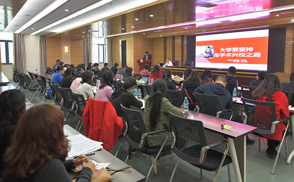 副校长杨新民教授以“大学要坚持走学术兴校之路”为题,从“高校为什么要走学术兴校之路、高校怎样走学术兴校之路”两个方面,分享了在习近平总书记关于科技创新的重要论述指引下,学术兴校的丰富内涵、时代要求以及实现路径。他指出,走学术兴校之路是目前高等学校发展的内在要求,是提升高校核心竞争力的根本途径,是构建和谐大学校园的关键所在,教学和科研之间在本质上并不冲突,两者协调统一于学术,相辅相成、互相促进。他强调,目前是学校发展的最好时期、教师发展的最好时期、学生发展的最好时期,并着重介绍了习近平总书记高度重视科技学术创新所出席的系列重要会议和重要讲话精神。他认为,高校走学术兴校之路,特色是根本,分类是基础,人才是关键,奖惩是动力,要坚持以错位发展为取向,坚持以科学分类为基础,掌控科技创新的优势和主导权。最后,他再次强调,大学是探求真理研究高深学问、培养高级专门人才的机构,强化学术权力、提升学术水平是大学在学术事业中创造自身价值的根本,是大学持续兴旺发达的根本。