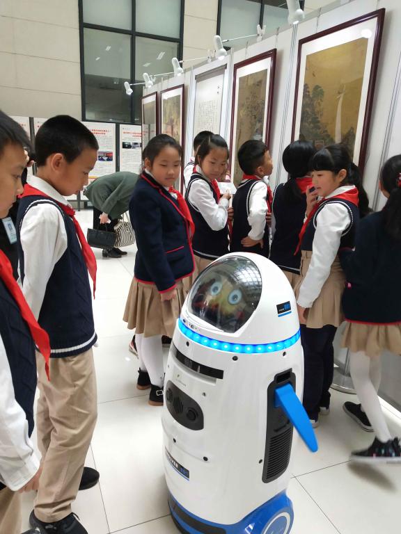此次国画艺术长廊展以历史为轴,展出各时期的名家巨作,每幅作品下均配有二维码,扫码可听主播精讲。另外,画展专门邀请重庆公图网络科技有限公司提供技术支持,定制了叮小胖智能机器人进行讲解和互动,打造出不一样的视听鉴赏观展环境。从22日开展以来,每天来参观的师生络绎不绝。23日中午,画展迎来了大学城第三小学的60名小客人,这些五年级的孩子在叮小胖的带领下领略了从战国到明清各朝代的经典画作,精美的构图艺术,巧妙的色彩运用,有趣的创作故事都带给同学们完美的鉴赏体验。而3D版的《清明上河图》则让大家身临其境感受了北宋都城的繁荣生活,同学们啧啧称奇。与机器人叮小胖的互动更是让此次参观达到高潮,同学们争着与小胖对话,他们一起聊天,一起讲历史知识,一起唱歌、跳舞,学生们真切感受到了科技与艺术的完美融合。