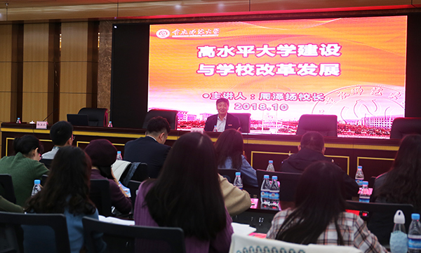 在与全体学员合影留念之后,周泽扬校长以“建设高水平大学和学校改革发展”为题,从三个方面作了首场专题报告。一是讲述了重师波澜壮阔、跌宕起伏的办学历程。周校长谈到了学校从专科升为本科、学院更名为大学、获得教育部本科教学评估优秀、大学城校区建设,以及成为博士学位授予单位等几个关键节点,发自肺腑地感慨学校成绩的来之不易,并特别感谢老一代重师人为学校今天的发展打下的家业和奠定的根基。二是成功更名为大学以后的办学理念、办学思路。周校长谈到,随着大学职能的三次转变,学校积极融入国家、地方发展战略。从“学科建设为龙头,教学科研为两翼”到提出“人才培养更有质量、教师产出更有水准、核心指标更有竞争”的内涵发展,再到2013年召开千人大会后实施“内涵发展、提档升级战略”,构建了师范教育和非师范教育“两轮驱动”,普通基础教育、职业教育和汉语国际教育“三驾马车”,文化传承与创新、决策咨询与公共服务、科技攻关与应用转化“三大版块”协同发展的特色办学格局。特别是,在不断的发展、探索、实践中,创新性提出了“两个维度,四个层面”的办学理念,以此作为检验办学质量高低的标准和切入点。“两个维度”,就是指“校内、校外”两方面。“四个层面”,就是指“校内、校外”两个维度各自包含的两个层面,即“校内”维度,主要看学科专业发展状况和学校文化建设状况;“校外”维度,主要看学校参与服务地方经济社会发展的广度和深度、广大校友的发展状况以及对母校的感情深厚程度。三是如何推进建设高水平师范大学。周校长在分析了目前高等教育面临的新形势和新要求之后,着重围绕“推进建设高水平师范大学”这一核心目标,提出高水平大学应该具有的“十大特征”:学科有实力、专业有名气、学术有影响、队伍有水平、育人有质量、开放有活力、服务有贡献、文化有引领、办学有特色、社会有地位,并从高水平大学的核心任务以及如何推进高水平师范大学建设四个方面进行了深入的分析说明。