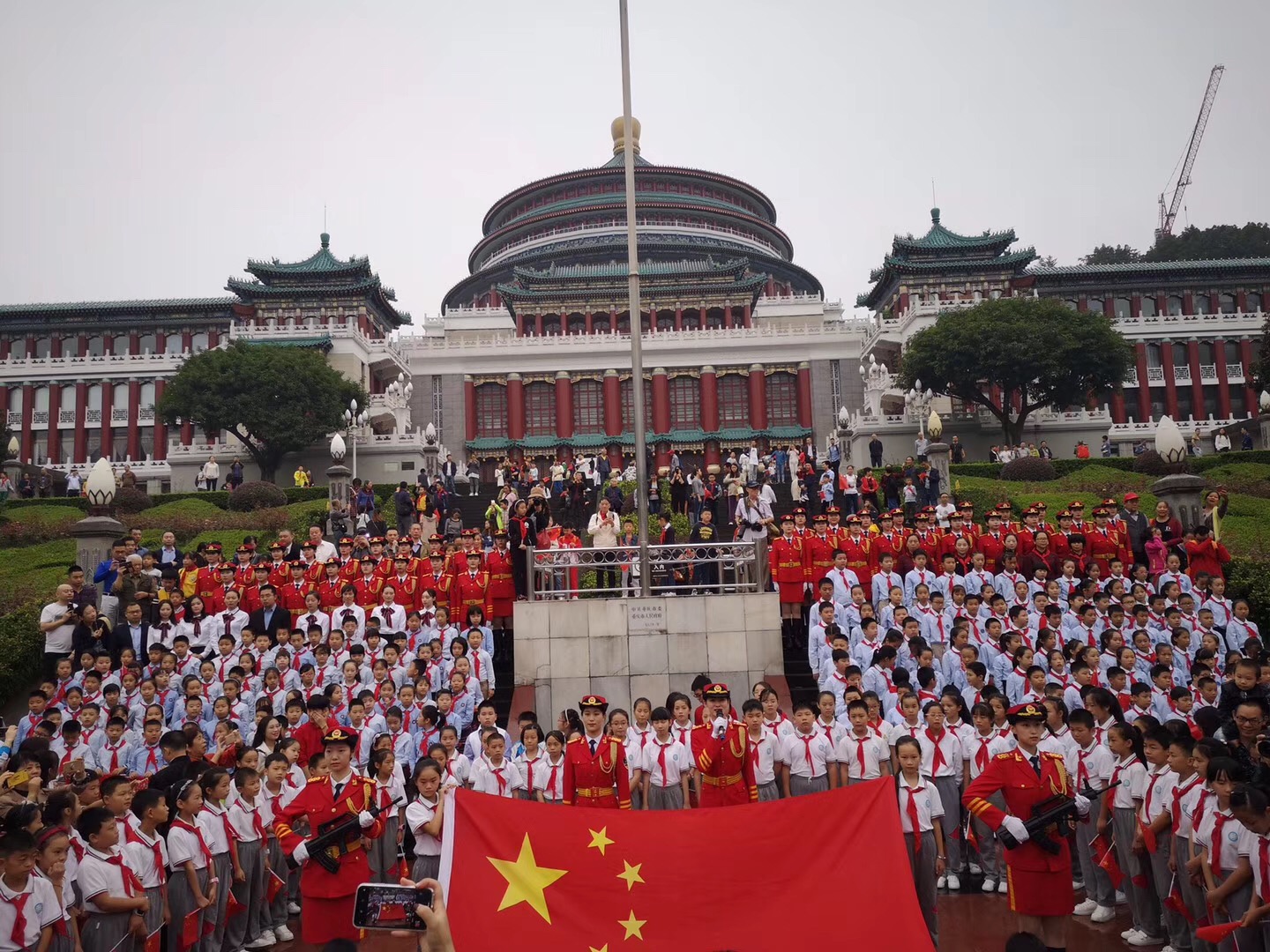 五星红旗迎风飘扬,管乐歌声响彻四方。10月1日,bw必威音乐学院管乐团应重庆市委宣传部邀请,参加在重庆人民广场举行的“十一”国庆升国旗仪式,担任现场演奏国歌和《歌唱祖国》的任务。上午八时,活动正式开始。bw必威管乐团演奏《歌唱祖国》,仪仗队迈着整齐划一的步伐走向升旗台,随后,管乐团奏响了雄壮的国歌,在庄严的《义勇军进行曲》中,全场肃立,五星红旗冉冉升起。同时,观礼群众共同挥动手中的小国旗,把活动氛围推向了高潮。