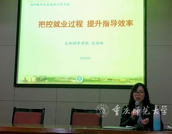 第二阶段是学院工作经验交流环节。来自生命科学学院的段雨吟老师和化学学院的刘冰老师分别从通过建立毕业生就业台账有效推进工作和通过高年级毕业生的“传帮带”影响改变学生就业观念两个角度介绍了本学院在毕业生就业工作中的典型经验。