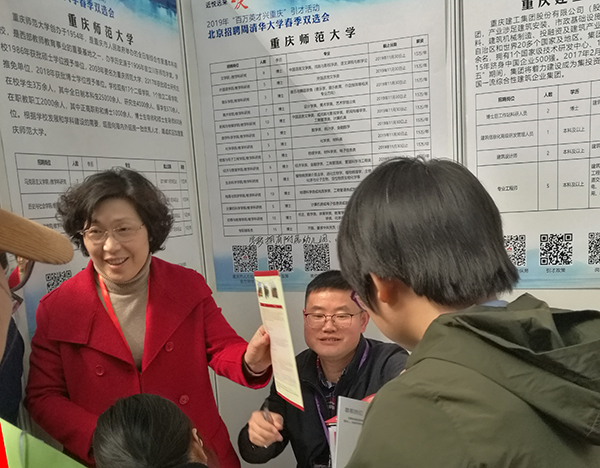 为贯彻落实重庆市科教兴市和人才强市战略计划的要求部署,深入推进实施学校人才强校战略,优化学校人才队伍学缘结构,学校人事处、人才办组织有关人员和用人单位参加了由重庆市人力资源和社会保障局主办、重庆市人才交流服务中心承办、重庆市人才大市场协办的“百万英才兴重庆”引才活动—北京招聘周,于2019年3月21日—23日先后赴中国人民大学、清华大学和北京大学开展高层次人才招聘。