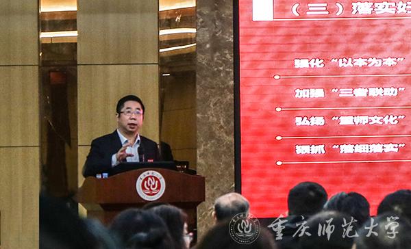 孟校长指出,要建设好高水平师范大学需要全体重师人在党委的领导下,心往一处想,劲往一处使,讲担当、讲落实、讲实效,重奖惩,努力形成奋进、和谐的校园氛围。通过重师人的努力,五年后实现“大学教育更加扎实,‘三者联动’更加显著,重师文化更加彰显,各项工作更加有效,重庆师大更加知名”的愿景。