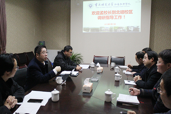 1月11日寒冬料峭,但北碚校区(初等教育学院)却暖意盎然。上午10时许,校长孟东方带着学校对北碚校区(初等教育学院)的关注、关爱,与校党政办主任陈进东、发展与规划处处长程新平一行到初等教育学院调研工作。