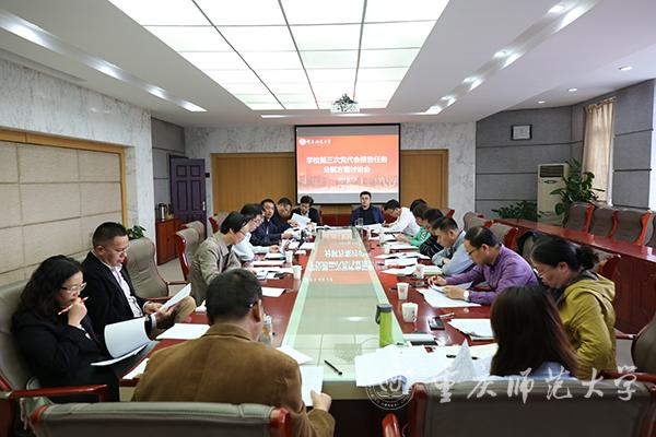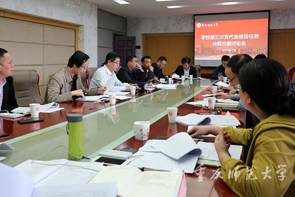 5月21日下午,学校在行政楼309会议室召开第三次党代会报告任务分解方案讨论会,党政办、组织部、宣传部、统战部、发规处、教务处、人事处、学生处、招就处、科研处、研究生院、国际处、财务处、基建处、后勤处、工会、团委、外联中心、信息中心等19个牵头责任部门主要负责人参加了会议。校党委副书记、校长孟东方主持会议。