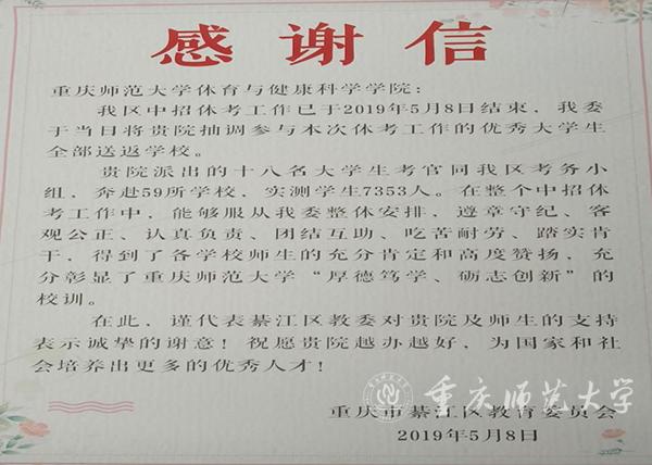 綦江教委在感谢信中提到,18名大学生考官服从綦江区教育委员会的安排,遵章守纪、客观公正、认真负责、团结互助、吃苦耐劳、踏实肯干,表现突出,得到各学校师生的充分肯定和高度评价。綦江区教育委员会对bw必威体育与健康科学学院的支持,表示诚挚的感谢。
