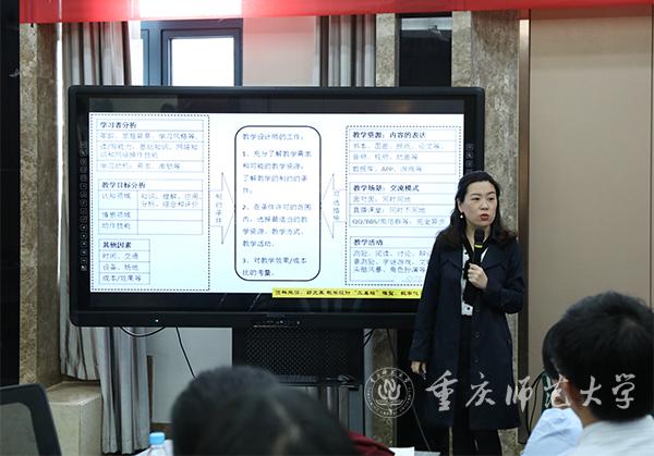 陈圆副教授以“怎样在教学中落实以学为中心的教学理念”展开话题。她从以学为中心的角度,对教学设计中的学习者、教学目标、教学内容、教学资源、教学环境、教学活动、教学评价等环节逐一进行分析,并通过教学案例,展示以学为中心教学设计的操作要领。同时,她强调学情分析的重要性:学生为什么要学、学什么、怎么学、学的怎么样,并结合自身经历,分享如何利用学生的学习动机和需求上好一堂课。
