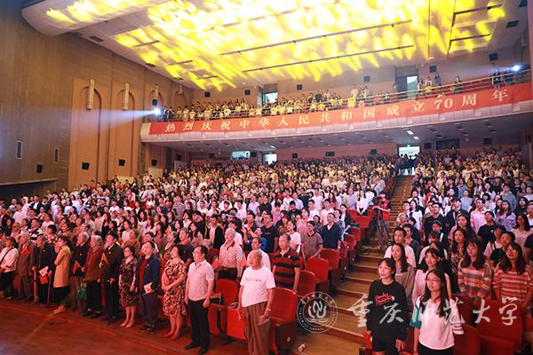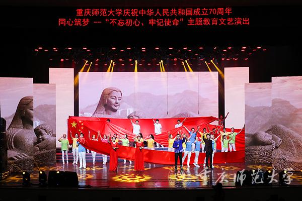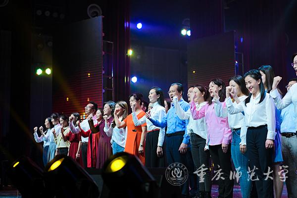 中国人民肩负着历史的使命,使命引领着担当,使命呼唤着未来。慷慨激昂的大合唱——《心中的使命》由师生员工自编自演,展现了重师人“自强不息,躬行师道”的使命与担当;歌舞《江山》撷取国庆大阅兵的灵感,让飒爽英姿的国旗班同学们展示出了人民军队的作风、纪律以及军容;“我站在三春湖畔向你报道……”“我站在图书馆向你报道……”在《我们在重庆师大报道》朗诵中,学校广播台的播音员们从幕后走到台前,为大家讲述了这些年来重师大取得的成就;“母亲啊中国,你让我永远铭刻”,伴随着饱含热爱与祝福的歌曲《致祖国》,本次主题文艺演出落下了帷幕。