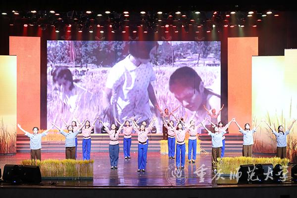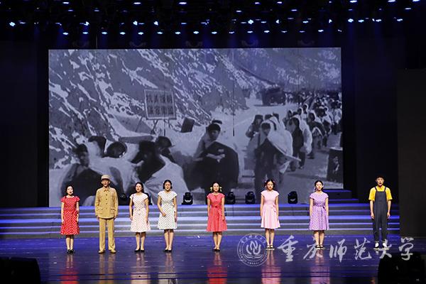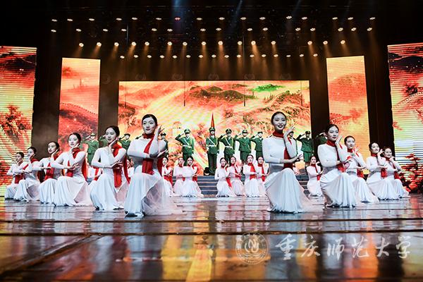 “东方红,太阳升,中国出了个毛泽东……”音乐学院丝路合唱团带来《东方红》,新闻中心与重师附属小学的学生合作情景表演唱《没有共产党就没有新中国》表达出人民群众对党的深情;朗诵《谁是最可爱的人》凸显了朝鲜战争中战士们浴血奋战的英雄精神。国歌奏响于这两个节目之间,巧妙地融入剧情。在场人员全体肃立,高歌唱响爱国情;舞蹈《沿着社会主义大道奔前方》以百姓“丰收”之喜描述了中国人民跟着党走社会主义道路所收获的美好生活。