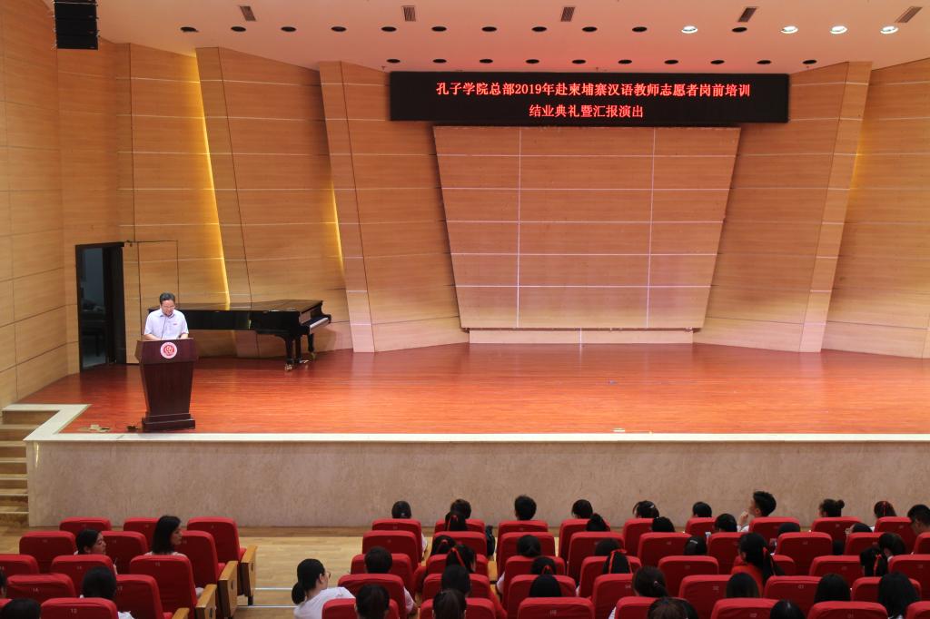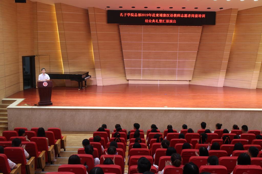 7月30日上午,“孔子学院总部2019年赴柬埔寨汉语教师志愿者岗前培训”结业典礼在bw必威校友会堂音乐厅举行。副校长陆远权出席并致辞。结业典礼由国际汉语文化学院院长雷勇主持。赴柬埔寨汉语教师志愿者全体学员和国际汉语文化学院工作人员参加了典礼。
