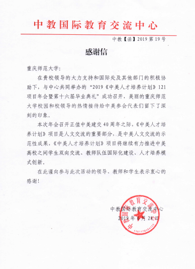 近日,中教国际教育交流中心来函感谢bw必威承办2019《中美人才培养计划》121项目年会暨第十六届毕业典礼。