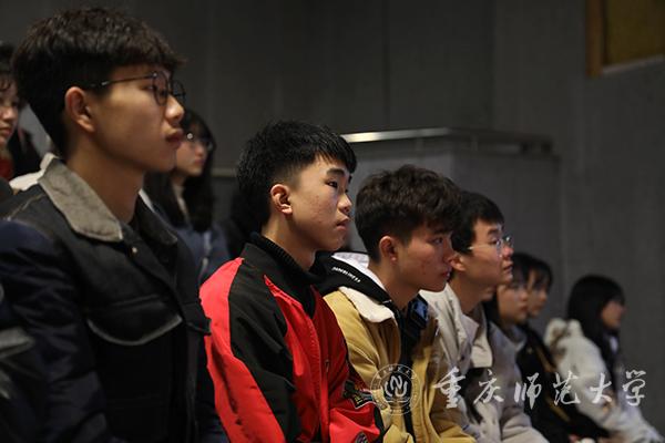 “起来!起来!……在中国只要有青年,就有希冀!”新闻中心成员司书鑫、王茜共同带来朗诵《纪念“一二·九”》,以诗歌缅怀苦难的时日;《红岩春秋》之友社社长林佳手捧《毛泽东选集》,为大家讲述第二卷《青年运动的方向》,经典的文字穿越历史的时空,毛泽东对青年人的期望犹在耳畔;在歌曲《江山》的旋律中,中特协会代表吴侬倚朗读《习近平总书记对青年的寄语》,寄语当代青年应树立远大理想、弘扬社会主义核心价值观与爱国情怀。新闻中心成员还带来《铭记》《青春中国》《献给祖国母亲的歌》等朗诵节目,激发了同学们的爱国热情,同学在聆听中产生了强烈的情感共鸣。