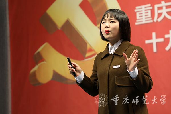 马克思主义学院思想政治教育专业的学生结合国情,引用大量鲜活的史料、事例和数据,声情并茂地对十九届四中全会精神进行了精确阐释。“奇迹,就是将不可能创造出可能。”《说说两个奇迹》凸显出新中国成立70年来,我们党领导人民创造了世所罕见的“经济快速发展”和“社会长期稳定”两大奇迹;《我看文化自信》宣讲掀起了现场的一阵热潮,台下的观众与台上的宣讲人产生强烈的共鸣“中国人民应该有这个信心,每一个中国人都应该有这个信心!”;《联林珍奇》的五组成员在《渔舟唱晚》的古筝伴奏中,吟诵数字联、回文联等30条对联,将对联的对仗美、字形美、音韵美与意蕴美体现得淋漓尽致;《我们是社会主义的建设者和接班人》则清晰地阐述了党的教育方针的历史演进,“德智体美劳”五育并举全面发展的新时代教育方针。宣讲人最后与大家共勉,努力成长为“志存高远,脚踏实地”的新时代有为青年、“德才兼备、知行合一”的高素质人才、德智体美劳全面发展的社会主义建设者和接班人。