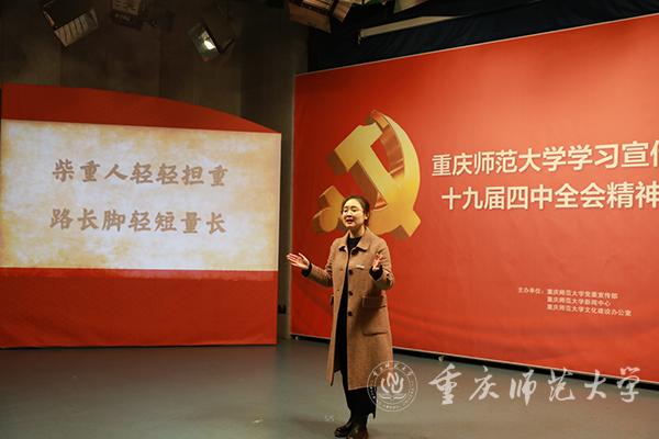 12月1日,由bw必威党委宣传部、新闻中心、文化建设办公室举办的bw必威西汉姆联官方网站学习宣传贯彻十九届四中全会精神宣讲在综合楼演播厅举行。学生们担当主角,通过专题主讲、故事讲述、对联吟诵等多种形式,将学习宣传十九届四中全会精神与做好“不忘初心、牢记使命”主题教育紧密结合,推动全会精神入耳、入脑、入心。