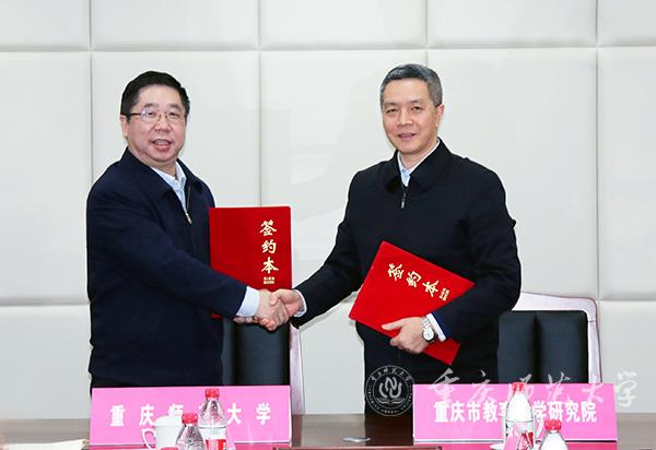 孟东方校长和重庆市教科院蔡其勇院长代表双方签署了合作协议。双方基于共同的社会责任和工作使命,本着平等协商、资源共享、合作共赢、协同创新的原则,将在建立互通的合作发展制度、构建综合的人才培养模式、构建联合的学科科研机制、建立联动的服务社会平台等方面加强战略合作,通过建立联席会议制度、专项工作制度保障各项合作任务有效推进和如期完成。