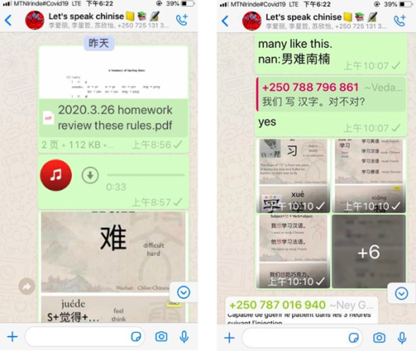 疫情期间,针对学生普遍网络设备不足、居住地网络不稳定等情况,卢旺达大学汉语教师们按照简便易行、方便学生、确保效率的原则,切合实际地选择了各班早已建好的What's app学习群作为学校课堂的有效“替代品”,在学习群中与学生互动,发布课件、讲解课程、语音答疑、布置作业并批改反馈,实现了“停课不停教、停课不停学”,取得了优质的教学效果。