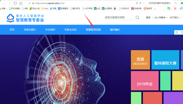 在浏览器中输入网址:http://www.cqscie.com直接进入网站主页,然后点击“智慧教育资源”,即可进入《人工智能与创客课堂》。