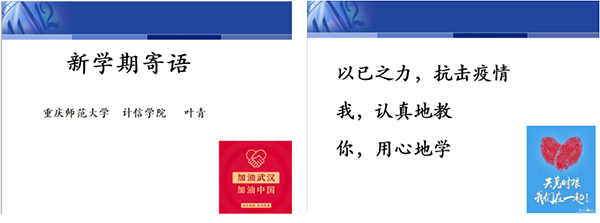 2020年2月24日8点过,叶青老师熟练地打开电脑,准备开始新学期的第一堂新课。与以往授课不同的是,这次她不再是身在教室,而是待在家里。屏幕上,显示出叶老师精心准备好的PPT材料——新学期寄语。伴随着叶老师柔和而清晰的嗓音,屏幕那头电子商务专业的同学们开始了在家上的新学期第一堂线上教学。课上,叶老师号召大家“我,认真教;你,用心学”,以已之力抗击疫情。