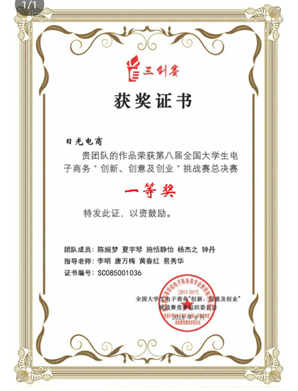 | 全国大学生电子商务“创新、创意及创业”挑战赛一等奖 |