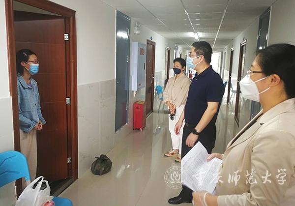 进入楼栋,孟校长一行依规进行了登记和体温测试后,走访看望了来自教育科学学院、经济管理学院、马克思主义学院等多个学院的湖北返校学生。孟校长询问同学们的生活情况,鼓励同学们增强信心,要求同学们遵守学校健康管理规定,以实际行动共同打好疫情防控的总体战、阻击战。孟校长对各个学院开展的湖北返校学生假期心理健康工作表示了充分的赞扬与肯定,同时对节日期间慰问、送餐流程是否安全快捷等工作现场作出了相应的部署与优化。