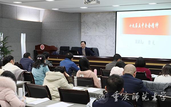 最后,毛宇部长对本次宣讲报告会进行总结交流。她表示,在对党的十九届五中全会精神的学习中能够体会到党和国家未来发展的美好前景。她向与会人员提出三点希望,一是在组织生活中带领党员同志深刻学习领会党的十九届五中全会精神,做好支部书记的本职工作;二是将国家“十四五”规划指导思想中的四个关键词——高质量、供给侧结构性改革、改革创新、满足人民日益增长的美好生活需要,贯穿于教育教学、人才培养、科学研究、社会服务的始终;三是发挥重师人的主人翁精神,通过学校“十四五”规划专题网站等相关渠道,积极建言献策,共绘学校“十四五”蓝图,将个人智慧转化为推动学校发展的巨大力量。