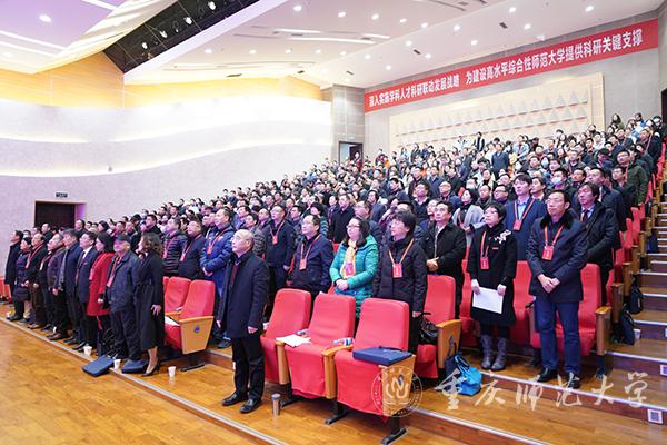 上午九点,大会在雄壮的国歌声中拉开帷幕。与会代表满怀激情地观看了“bw必威西汉姆联官方网站科研事业进展”宣传片,回顾了近六年以来全体重师科研人的精神风貌和学校科研发展取得的喜人成绩。在科学研究“内涵发展、提档升级”战略推动下,学校的核心科研成果呈现跨越式增长,标志性科研成果不断涌现,重大科研成果实现历史性突破,学校科研整体实力得到显著提升,学术影响力和美誉度进一步彰显。