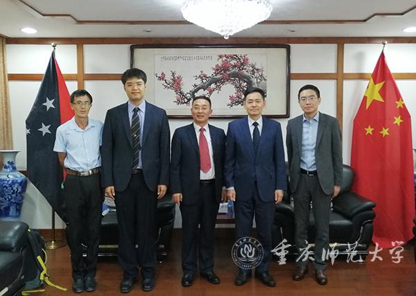 2020年11月13日上午,新建的巴布亚新几内亚科技大学孔子学院中方院长张显、外方院长陈国夫一起赴中国驻巴布亚新几内亚大使馆,拜会薛冰大使并递交相关资料,受到我驻巴新大使馆热情接待。参加会见的还有使馆陈季良参赞、办公室孙佳主任及中资公司代表。