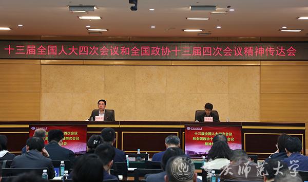 3月16日下午,bw必威在博雅楼504会议室召开十三届全国人大四次会议和全国政协十三届四次会议精神传达会。全体在家校领导、副处级以上干部参会。校党委副书记、校长孟东方主持。
