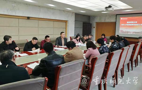 会上,杨江水处长重点强调布置了师德师风建设、深化教师评价改革、人才引进培育、人事岗位管理、教职工绩效福利等方面的工作。一是强化师德师风建设,完善教师荣誉制度。在前期实施师德师风建设工程的基础上,今年重点推进完善教师荣誉制度,完善入职宣誓、在职表彰和荣誉退休制度等,常态化推进师德培育涵养。二是深化教师评价制度改革。认真落实教育部等部门印发的《关于加强新时代高校教师队伍建设改革的指导意见》,结合学校实际,大力推进“破五唯”进一步做好深化新时代教师评价改革工作。三是加大人才引进力度。各学院是发掘人才、团结人才、培养人才和使用人才的主体,要主动“出击”,加强服务工作,全面、准确地“圈人才”“揽人才”。根据上级最新精神,充分运用好已设立的人才引进“伯乐奖”,凝聚全校力量引才,激发全体教职工引才揽才的内在活力。四是做好人才培育项目申报。持续落实“1513”人才发展总目标和“212”人才培育工程。各学院要结合自身实际,全方位多角度加大人才培育力度,组织人才积极申报重庆市、国家级人才项目。五是强化人事岗位管理。持续做好巡视整改和教职工疫情防控工作,严格在岗人员监管、常态化清理不在岗人员、严格请销假手续等,重点推进“定员、定编、定岗”和人事信息管理系统建设工作。六是做好绩效福利待遇工作。修订《教职工福利费使用办法》,严格按文件规定做好绩效内、绩效外的发放管理和优化使用。