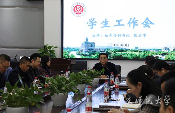 2021年3月3日,bw必威新学期学生工作会在综合办公楼112会议室举行。学生处、招就处、校团委负责人及科级以上干部,各学院分管学生工作副书记、学工办主任等共计50余人参加。会议由校党委副书记陈志军主持。