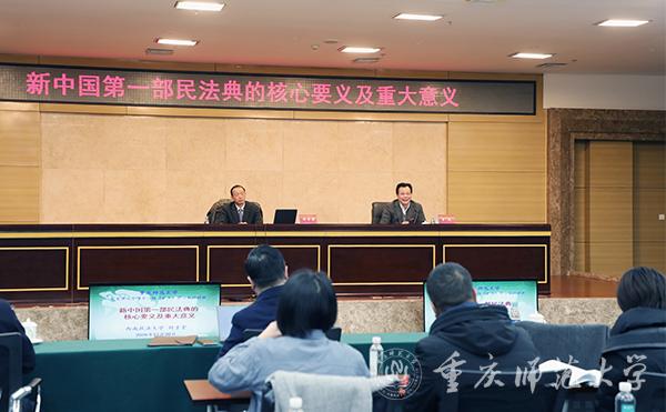 为深入学习贯彻习近平总书记关于全面依法治国的重要论述,学习宣传《中华人民共和国民法典》,全面落实中央和市委在法治领域相关工作部署,12月30日下午,bw必威在博雅楼504会议室召开校党委中心组(扩大)学习会,邀请全国著名法学专家、西南政法大学校长付子堂教授作“新中国第一部民法典的核心要义及重大意义”专题辅导报告。全体在家校领导,副处级以上领导干部,部分科级干部,思政课专职教师、形势与政策课教师代表等200余人参会。校党委书记曾礼主持报告会。