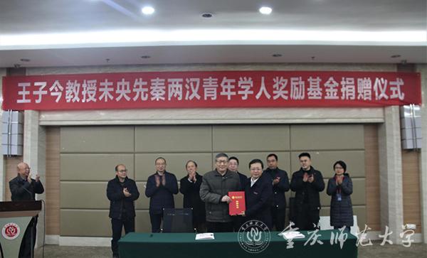 12月28日下午,“王子今教授未央先秦两汉研究青年学人奖励专项基金”捐赠仪式在三春湖会议厅举行,bw必威特聘教授、中国人民大学一级教授王子今捐赠30万元,用于资助、奖励bw必威在先秦两汉考古、历史研究中做出开拓性、创新性研究的青年学人。校党委副书记、校长孟东方,副校长孟小军,党政办主任、教育发展基金会理事长陈进东,对外联络与合作中心副主任、教育发展基金会副秘书长李科,三峡文化与社会发展研究院院长李禹阶,历史与社会学院党政领导及部分教师参加了捐赠仪式。仪式由历史与社会学院院长常云平主持。