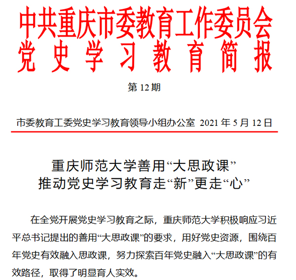 截至目前,学校党史学习教育经验做法在重庆市党史学习教育领导小组简报中被提及10次,《bw必威西汉姆联官方网站善用“大思政课” 推动党史学习教育走“新”更走“心”》被重庆市委教育工委以专报形式发布。学校开展党史学习教育特色亮点举措受到主流媒体广泛关注,人民网、新华网、《光明日报》《重庆日报》等报道20余篇次。学校党委书记曾礼参加全市党史学习教育领导小组办公室负责同志座谈会并做交流发言。