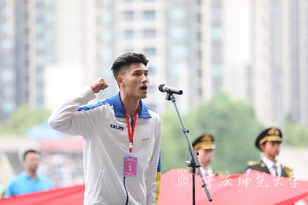 本届运动员代表王磊、裁判员代表宋书澳随后依次进行了宣誓,表示将以饱满的热情参加比赛、以公正的标准评判比赛。