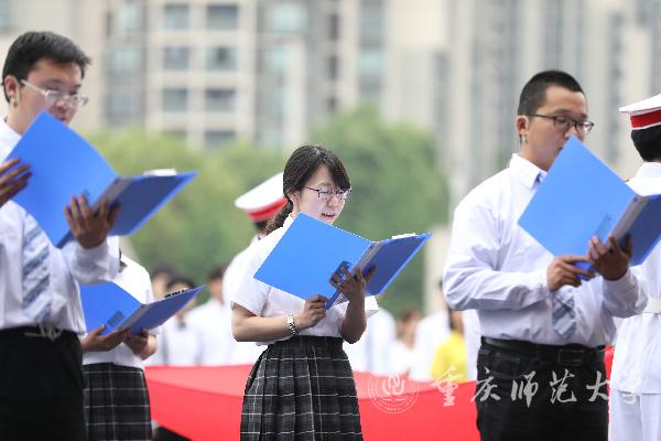 26个风格各异的方阵,26支满腔热忱的队伍。作为赛会的公平使者,裁判员方阵率先出场,全场掌声雷动。各学院方阵独出心裁,精彩纷呈。马克思主义学院将方阵变换出党旗图样进入会场,以建党100周年和党史学习教育主题诗朗诵掷地有声,队员们用红黄两色手花不断变化出重师校训、办学理念、“三名四气”文化特质等内容,标有“红船精神”“抗疫精神”等字样的15面旗帜穿梭其中,立体党徽的压轴亮相把会场气氛推向高潮。“有爱友善,同心同德”,化学学院表演方阵的口号妙趣横生,由不同化学元素的谐音组成,展现了化院人钻坚研微、驰骋赛场的别样风采。敲起大鼓、舞动大红绸缎,历史与社会学院表演方阵喜庆欢快的秧歌别具风味。匕首操、武术、健美操……热血沸腾的专业技能表演展示出体育与健康科学学院的精气神。音乐学院在《我的祖国》歌舞表演中融入党史学习教育主题说唱,奏响青春活力的重师之声。附属学校方阵首次在校运会中亮相,开朗活泼的小朋友们踩着轮滑帅气入场,一张张稚气童真的笑脸赢得全场观众的热烈欢呼。至此,入场式环节告一段落。