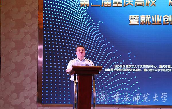 校党委常委、宣传部长毛宇代表学校致辞,对市委宣传部、市版权局、市教委、各兄弟院校、专家评委及各招聘单位表示欢迎,对给予此次大赛大力支持和帮助的领导和嘉宾表示感谢。她表示,学校将一如既往地推进大赛有序开展,将重庆市高校“版权杯”文化创意设计大赛办成有影响力的重庆文化品牌活动。
