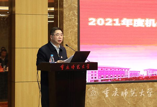各单位述职结束后,孟东方校长对各职能部门的述职汇报作了点评。孟校长充分肯定了各部门在2021年度取得的工作成绩。考核述职的效果很好,有几个特点:一是“新人”述“旧人”的职。新老工作交接比较顺利平稳,新人进入角色快,体现了新的气象,充分彰显了各单位的亮点和特色,多数部门都有可圈可点的工作成绩。二是政治站位高。围绕中心工作开展,履行了一岗双责,加强了党的建设,强化了政治引领,克服了经济形势和疫情的不利影响。三是顶层设计发展态势良好。四个五年行动计划的年度任务落实情况好,主要指标都有增长,发展态势总体较好。四是重点工作和专项任务完成好。在干部调整、学科建设、专业认证、就业工作、疫情防控、文化建设等方面,都取得了显著成绩。各单位更加重视学生工作大会、研究生教育工作会议精神的落实。重庆应用数学中心在人才引进、健全制度、工程项目等方面取得积极进展。五是达到了考评和交流的目标。通过述职考评,达到了交流工作、共同提高的目的。对今年的工作也有基本的思考,有利于今年工作早谋划、再起步。孟校长也指出,工作中还存在一些不足:一是有些部门抓实抓细不够,几年的汇报亮点不够突出,有些部门的述职不以事实、不以数据说话,内容显得有些空,支撑性不够。二是有些部门责任担当不够,发展不平衡。个别单位执行力不够,成效不明显,工作起色不大。个别单位工作开拓性不够,聚焦学校阶段性发展重点任务、重大工作还有提高的空间。三是服务基层还有待加强,服务的水平还有提高空间。四是各部门的协调联动还需加强,还要进一步形成工作合力。