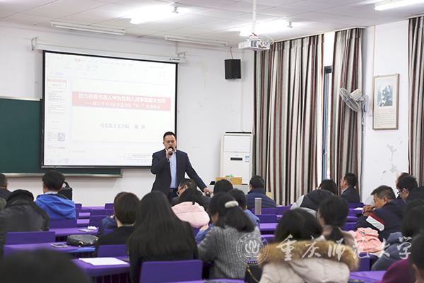 为深入学习贯彻习近平总书记在庆祝中国共产党成立100周年大会上的重要讲话精神,全面把握习近平总书记“七一”重要讲话精髓,11月25日下午,数学科学学院党委在学院122会议室举行了“努力在教书育人中为党和人民争取更大光荣——深入学习习近平总书记‘七一’重要讲话”的专家辅导报告会,主讲专家为党史学习教育市委宣讲团成员、马克思主义学院教授陈洪同志。会议由学院党委书记杨江水主持,学院全体教职工参加报告会。