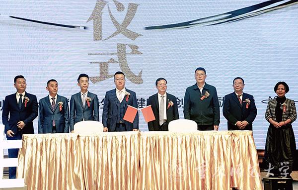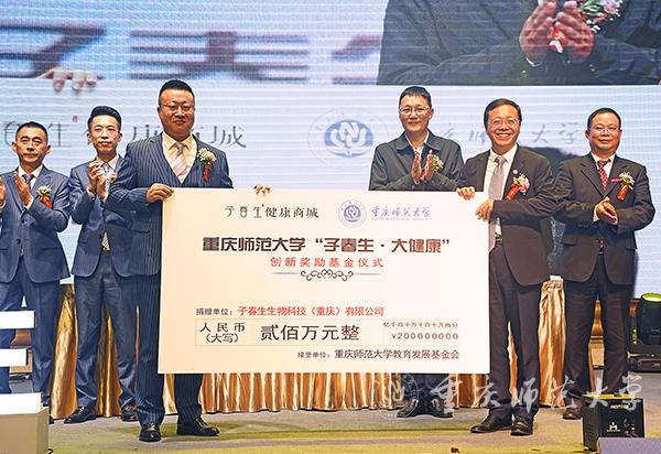捐赠仪式上,子春生生物科技(重庆)有限公司顾问、重庆市政协原秘书长周群致辞。bw必威对外联络与合作中心主任、教育发展基金会副理事长付长波与子春生健康商城CEO赵锴代表双方签署捐赠200万的“子春生·大健康”创新奖励基金协议。