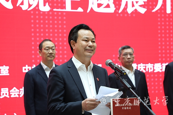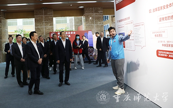 “今年的4月15日是第七个全民国家安全教育日,2022年是中国共产党第二十次全国代表大会召开之年。”校党委书记曾礼在开幕式上简要介绍了学校近年来开展的国家安全日教育活动以及此次主题展的背景与布展情况。他谈到,学校历来高度重视“总体国家安全观”教育,依托教育部高校思想政治工作创新发展中心扎实开展大学生国家安全教育。一是在市委国安办、市委宣传部、市教委等部门的支持指导下,树立大思政观念,把国家安全教育、思想政治教育、专业科学教育三者有机融和,把显性教育和隐性教育统一起来,内化思想引领,强化国家安全意识。二是通过举办国家安全教育教学风采展示大赛、国家安全教育思政公开课等活动,采用情景对话、讲述诵读、青春歌舞、情景演绎、多媒体技术等新颖形式,每年坚持开展国家安全主题宣传教育。三是深化教育培训,以庆祝中国共产党成立100周年活动、“党史资源+沉浸式教学”“国培计划”等形式,聚焦载体融入、聚力路径创新、聚效质量增强,引导广大师生增强“四个意识”、坚定“四个自信”,提升维护国家安全能力。四是开展专题研究,就重庆市国家安全教育基地建设情况开展了课题研究,形成了调研报告,并提出了重庆市国家安全教育基地建设的思路及建议。