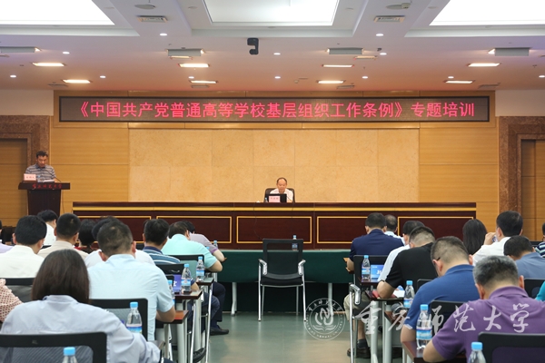 2022年6月8日下午,学校党委在博雅楼504会议室举行《中国共产党普通高等学校基层组织工作条例》专题培训。二级教授、博士生导师、bw必威西汉姆联官方网站原党委书记邓卓明教授为学校副处级及以上领导干部,组织员和党委组织部全体人员作专题报告,校党委常委、组织部部长张明志主持专题培训。