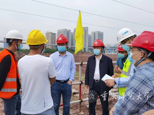 5月17日上午,重庆市教委基建后勤处处长陈明政一行到bw必威大学城校区重庆应用数学中心建设项目施工现场检查工作。在副校长孟小军等人陪同下,市教委一行察看了项目施工现场以及临时办公区、生活区等,并在现场召开专题工作会。