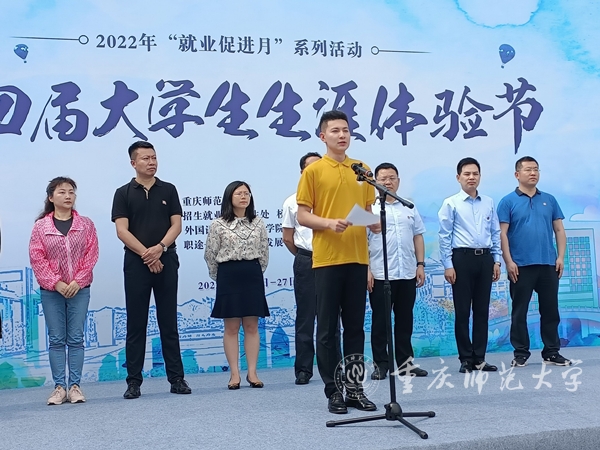 重庆市就业创业指导专家库成员、外国语学院辅导员湛欣,2021级化学专业学生朱泽明分别作为教师代表和学生代表发言。湛欣以老木匠建房的职业故事为题,讲述了自己对职业生涯规划的认识以及作为生涯教育工作者的付出和收获,鼓励同学们以王红旭、胡忠、曹瑾等优秀学长学姐为榜样,做好职业规划,为“强国有我”贡献青年担当。