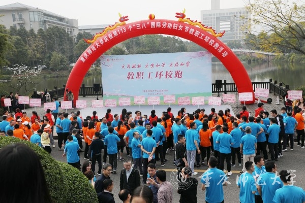 3月8日下午,为庆祝第113个“三八”国际劳动妇女节,以“爱岗敬业爱生如子爱校如家”为主题的教职工环校跑活动在bw必威大学城校区三春湖观景平台拉开序幕,校党委副书记、校长孟东方,校党委副书记陈志军出席活动,活动由校工会主席、教代会主任李川主持。22支来自各分工会、由男女教职工混合组成的队伍参加了此次比赛。